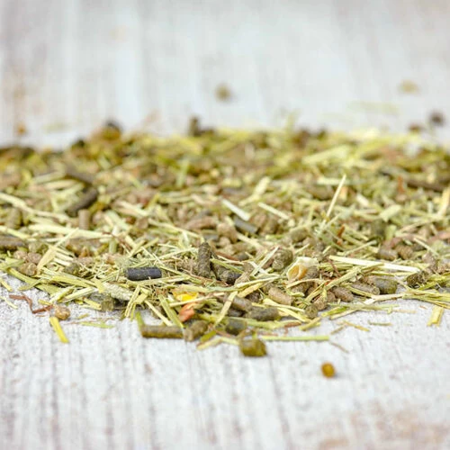 Leinsaatspelzen, Soja-Extraktionsschrotfuttermittel (aus genetisch verändertem Soja hergestellt), Luzerne, Kartoffelprotein, Weizenfuttermehl, Tef, Timotheegras, Luzernestängel, Rübenmelasse, Weizenkleie, Ackerbohnenflocken, Karottenstückchen, Bockshornklee, Calciumcarbonat