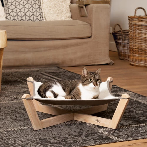 Ist Ihre Katze den ganzen Tag aktiv? Dann braucht sie einen schönen Platz zum Ausruhen. Verwöhnen und überraschen Sie Ihre Katze mit der Hängematte Gaia von Designed By Lotte. Die Hängematte hat Holzbeine. Der Gewebeteil besteht aus weichem Polyestergewebe und Leinengewebe. Das schafft einen schönen weichen Ort. Das Gewebe lässt sich leicht lösen und bei Bedarf bei 30 Grad in der Waschmaschine waschen. Die Hängematte hat auch Schutzfüße für das Holz. Eine durchschnittlich große Hauskatze kann die Hängematte benutzen. Wiegt Ihre Katze etwa 8 kg? Kein Problem dieses Gewicht kann die Hängematte tragen.