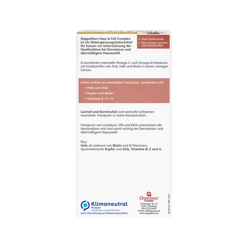 Doppelherz Haut & Fell Complex für Katzen sind leckere, cremige Licks zur Unterstützung der Hautfunktion bei Dermatose und übermäßigem Haarausfall. Ebenso hilft es gesunden Hunden, die normalen Funktionen von Haut und Fell zu erhalten. Es kombiniert wertvolle Omega-3- und Omega-6-Fettsäuren mit Biotin, Bierhefe, Kupfer, Zink und den Vitaminen B, E und A. Die wichtigen Omega-3-Fettsäuren EPA und DHA sind essentielle Nährstoffe für gesunde Haut und ein glänzendes Fell.