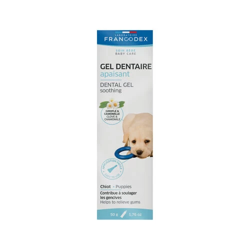 Francodex beruhigendes Zahngel unterstützt während der Zeit des Zahndurchbruchs Ihres Welpen. Das Gel hilft, das Zahnfleisch zu beruhigen und unangemessenes Beißverhalten zu reduzieren.