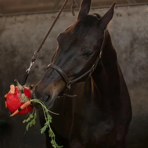 Ob Sie den Ball im Stall oder auf der Wiese (über die obere Schlaufe) aufhängen möchten – alles ist möglich! Die angebrachten Gummibänder erleichtern auch die Befestigung von Heu, Gras oder Snacks. Die Schlaufe macht es auch sehr einfach, den Ball aufzuheben. Garantierter Spielspaß!