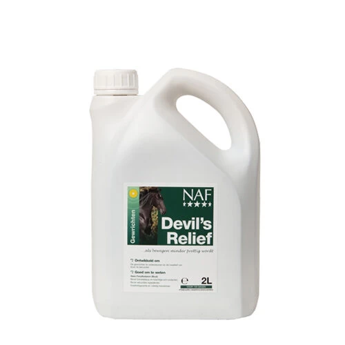 NAF Devils Relief von NAF Equine ist ein leistungsfähiges Kräutergetränk aus Extrakten von Teufelskrallenwurzel und weiteren wohltuenden Kräuter-Tinkturen. Das Medikament soll die Gelenke bei Pferden unterstützen, vor allem bei älteren Tieren. Die Kräuter unterstützen den Bewegungsapparat und die Verdauung, da es sich um bittere Kräuter handelt, welche die Magensäfte stimulieren. So kann das Pferd auch im Alter fit bleiben.