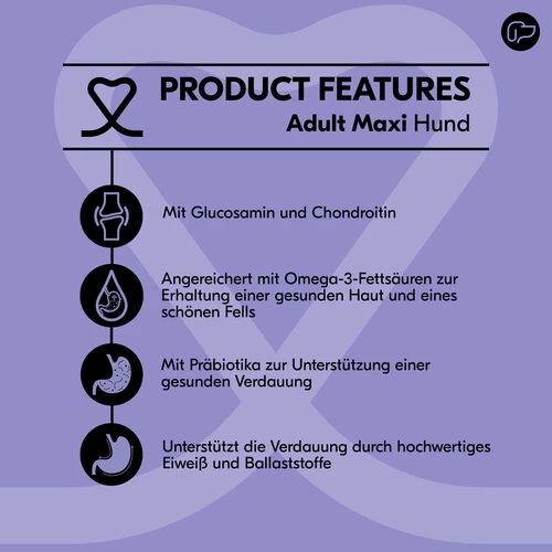 Die Ernährung spielt eine wesentliche Rolle für die Gesundheit Ihres Hundes. Vetality Adult Maxi wurde speziell von Tierärzten entwickelt, um Ihrem Hund alles zu geben, was er braucht. Dieses komplette, schmackhafte und ausgewogene Futter basiert auf Huhn. Er ist leicht verdaulich. Hochwertige Proteine und Ballaststoffe unterstützen eine gesunde Verdauung. Lachsöl (mit DHA und EPA) trägt zur Erhaltung einer gesunden Haut und eines gesunden Fells bei. Darüber hinaus enthält das Futter Präbiotika für eine gesunde Darmflora. Mit dem Zusatz von Glucosamin und Chondroitin zur Unterstützung der Gelenke.